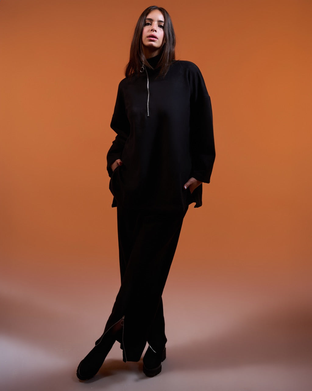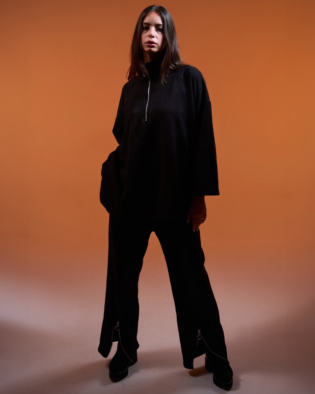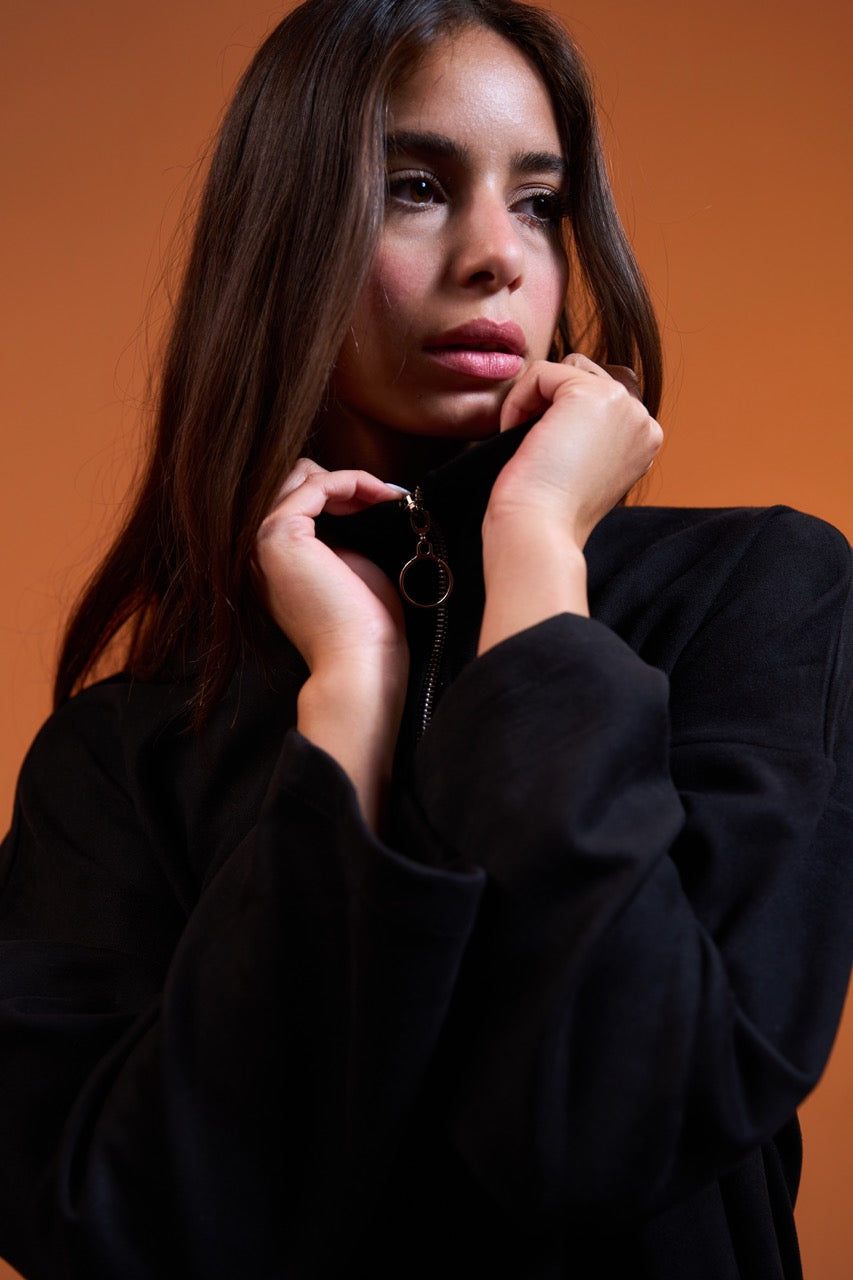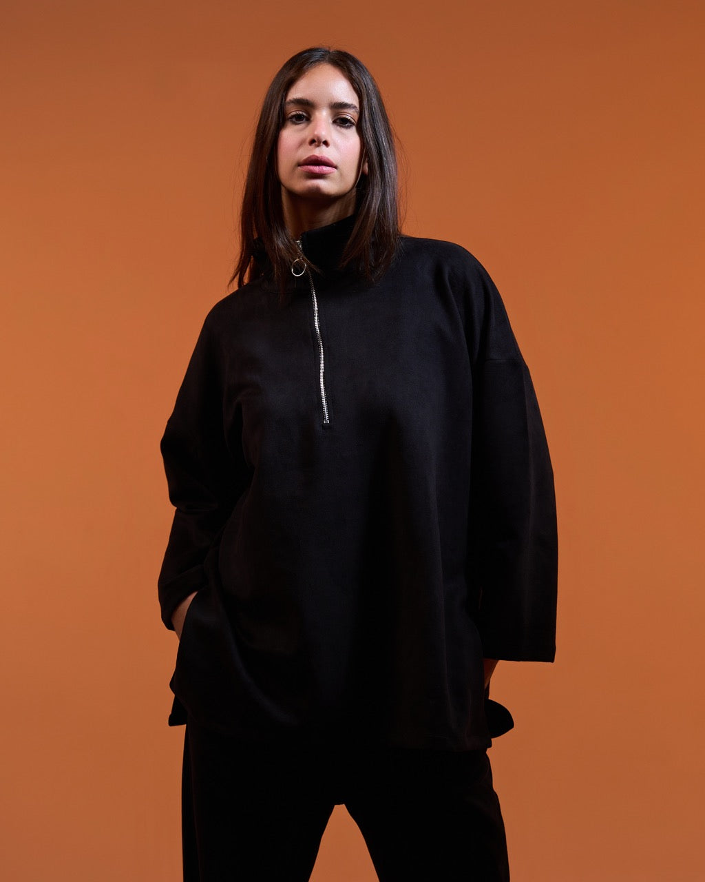 Elevate your casual style with our luxurious Suede Zippered Set. Crafted from premium suede fabric, this two-piece ensemble exudes sophistication and comfort. The high-neck pullover top features a sleek half-zip closure, adding a sporty-chic touch. The matching wide-leg pants complete the look, offering a flattering and relaxed fit.